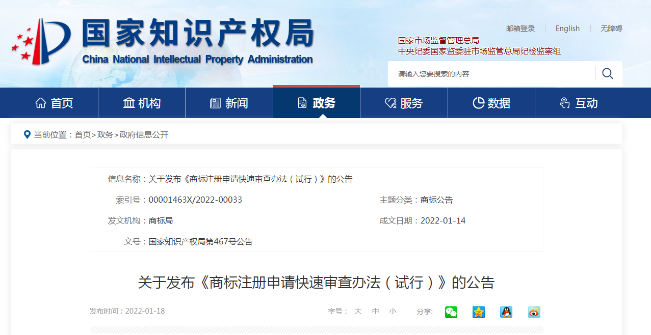 【國知局】關(guān)于發(fā)布《商標(biāo)注冊申請快速審查辦法(試行)》的公告
